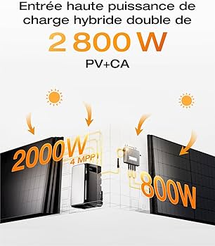 | Entrée solaire | 4 MPPT / 2 000 W / 11–150 V | Compatibilité avec la majorité des panneaux du marché |